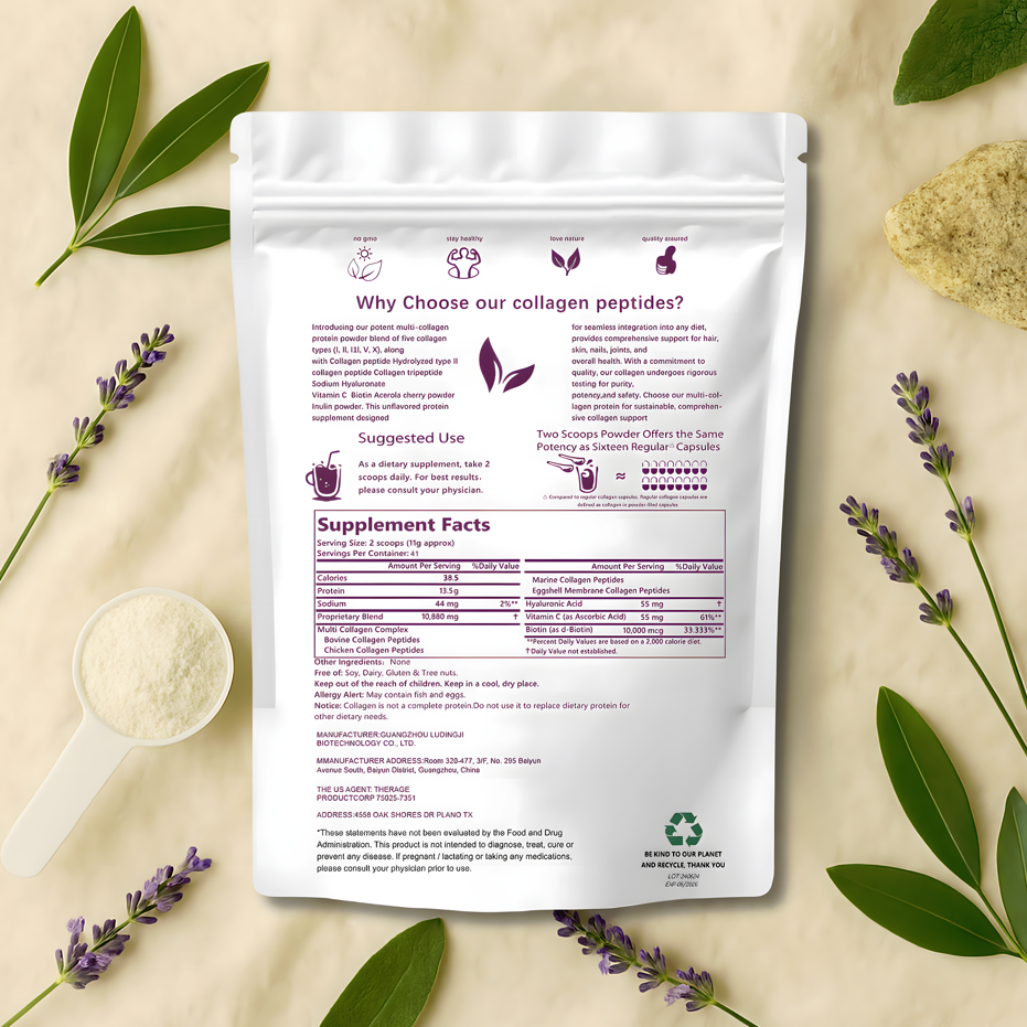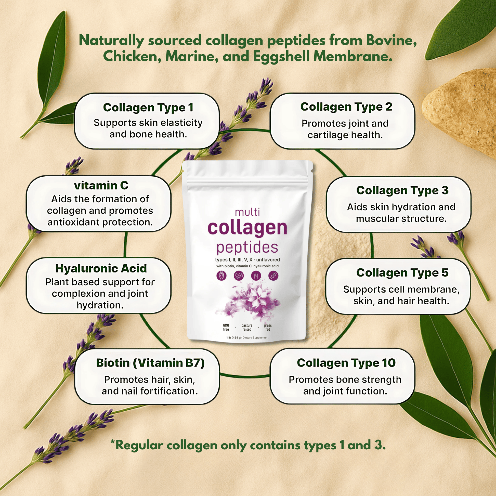 Transform your beauty routine with our multi-collagen peptides powder. With five types of collagen (I, II, III, V, X), plus biotin, vitamin C, and hyaluronic acid, this powder works deep beneath the surface to smooth fine lines, strengthen hair and nails, and keep your joints feeling flexible.